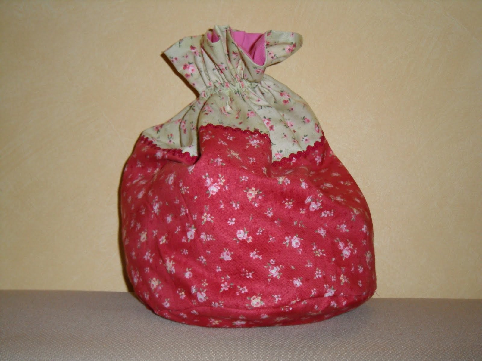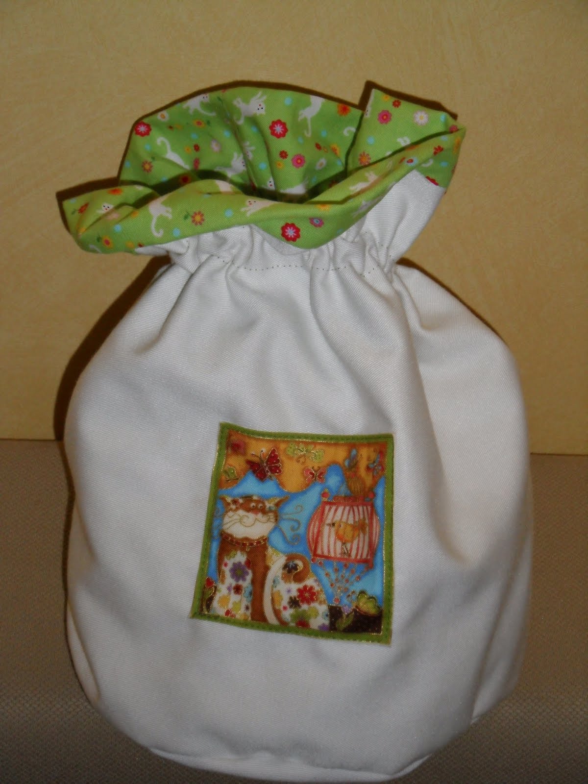 Enfin, j'en ai fait un couleur crème avec en appliqué un joli chat extrait d'un superbe tissu que j'avais encore en réserve. J'adoooore les félins et ce tissu. J'ai cette fois tenté de faire en sorte d'avoir une bordure en haut. C'est en fait la doublure, plus longue que le reste qui déborde ici. Elle "relève" l'ensemble du pochon je trouve.