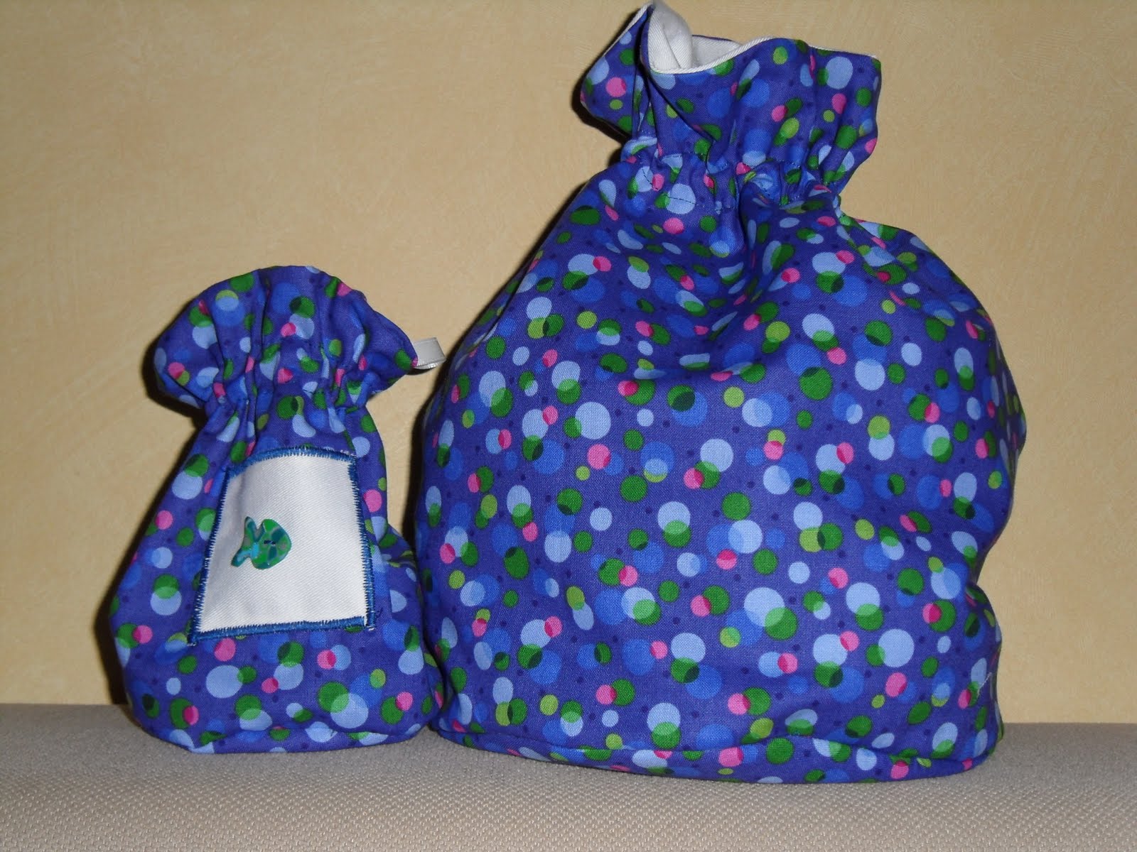 Voici donc le petit modèle et son grand frère, dans un tissus qui m'évoque la mer. J'ai ajouté sur le premier un petit poisson en fimo offert par Nectarine et pour le deuxième j'ai trouvé que le tissu se suffisait à lui même...