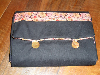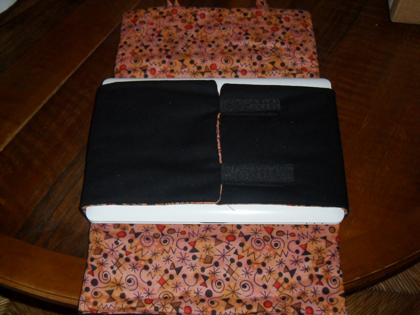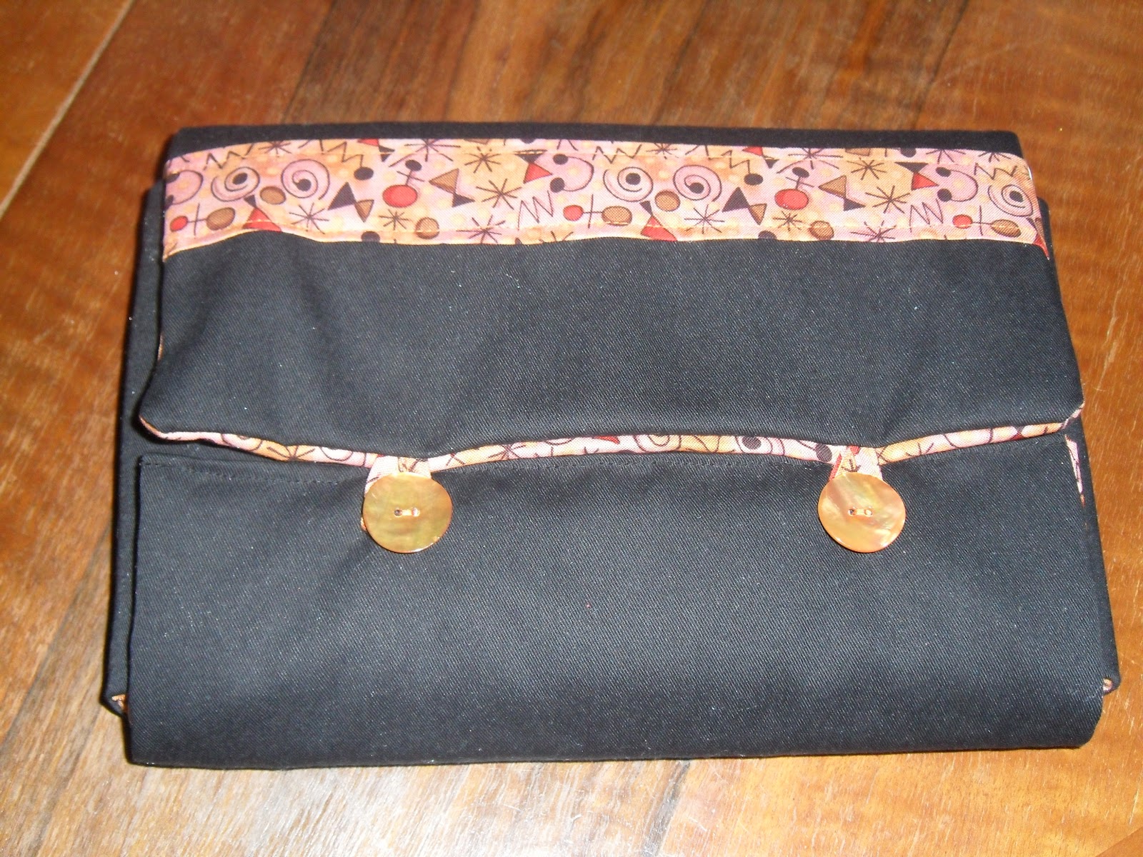 J'avais cousu il y a quelques mois une petite housse pour mon netbook. Il me restait à coudre un petit pochon pour transporter le chargeur, la souris (j'ai horreur des souris tactiles), le chargeur de mon téléphone et mon appareil photo. J'emmène souvent ces petites choses ensemble. C'est maintenant chose faite. Pour la housse j'avais fait l'extérieur dans un tissus noir et la doublure ainsi que la déco dans un joli tissus orange. J'ai fait l'inverse pour la pochette.