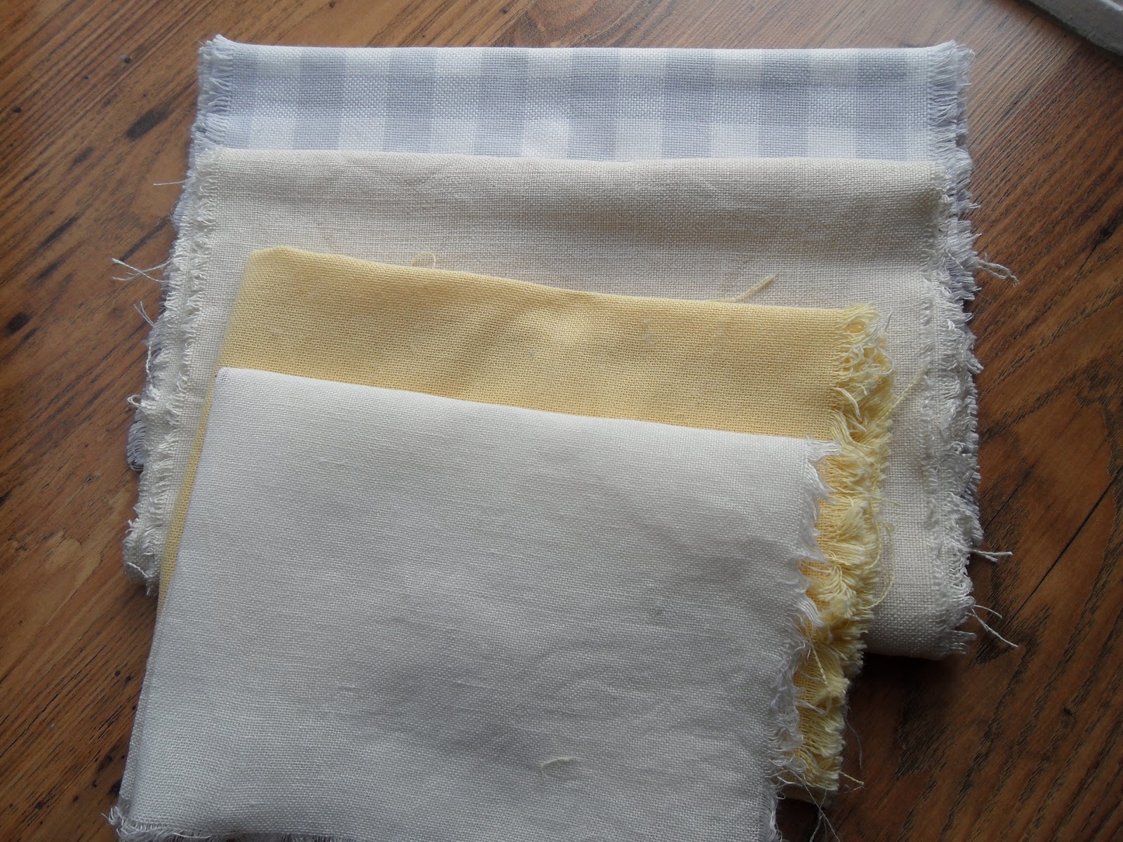 voici mes trouvailles: quelques coupons de lin et d'étamine à broder... j'aimais bien celui à carreaux même si ça va être difficile de broder dessus... le jaune est très doux... Il y avait aussi un morceau d'étamine de coton à coudre qui n'est pas sur les photos.