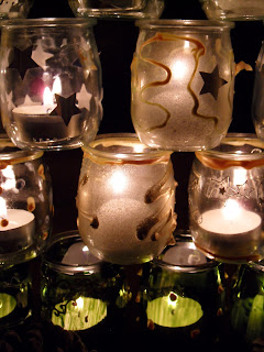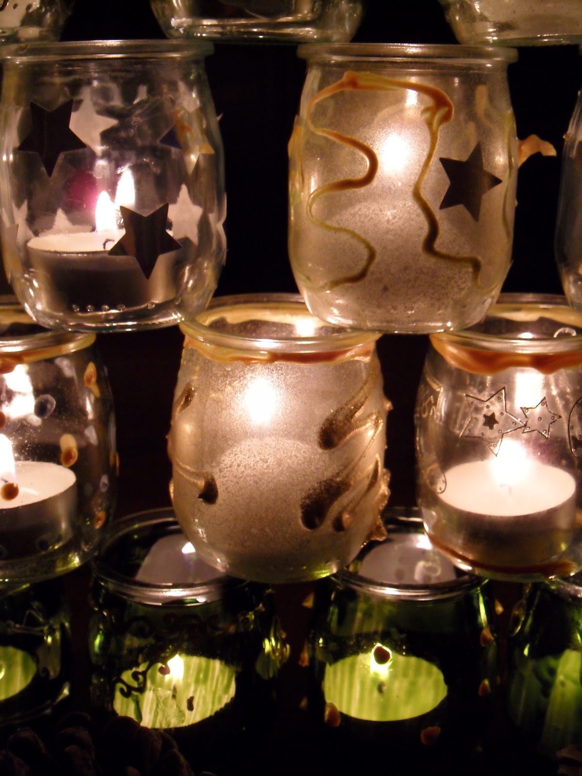 Quelques pots de yaourt, un peu de peinture et quelques gommettes dorées, des bougies chauffe-plats et hop voilà de jolis photophores qui vont aller réchauffer le coeur de la maîtresse, de la nounou sans oublier les mamies et autres bonne-mamans... Un beau symbole de cette fête qui illumine l'hiver...