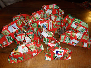 J'aime énormément Noël même s'il est vrai que c'est devenu une fête trop commerciale. Mmais avec un poil d'imagination on peut lutter contre cela. Père Noël ou pas j'aime beaucoup aider les enfants à fabriquer une petite bricole pour les gens qu'ils aiment. Une façon de leur transmettre le sens du partage lié à cette fête. Nous avons emballé leurs dernières merveilles cet après-midi... Qu'y-a-t-il dans ces petits paquets mystérieux???